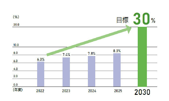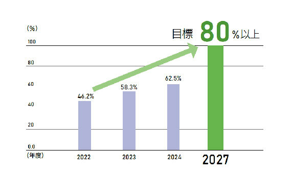 有給休暇年間取得日数12日以上の取得者の比率を2027年までに80%以上にする目標を掲げ、有給休暇取得推奨日の制定など社員が有給休暇を取得しやすい環境を作っています。