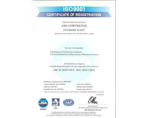JUKI has been committed to providing unbreakable JUKI quality since its founding.For industrial products in particular, we continue to maintain and improve JUKI quality. Our mission on the manufacturing front is to “keep customer factories running” by giving top priority to product reliability and stable operation. Thanks to its quality efforts, JUKI was recognized for its excellent quality control practices in the industrial sewing machine sector and received the prestigious Deming Prize for Implementation in 1981. These commendations attest to JUKI's sincere attitude toward quality and continuous efforts toward improvement.Now society's view of quality has become even more stringent.We will continue to clearly stress the high-quality standards of products and services as a distinct strength and will ensure that customers experience this quality for themselves.