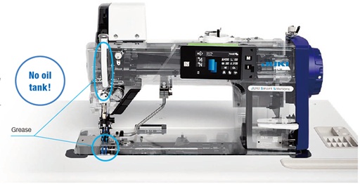JUKI’s proprietary lubrication control technology*² enables oil-free operation of the needle bar, thread take-up lever, and hook area. Oil stains on sewn products are a thing of the past.