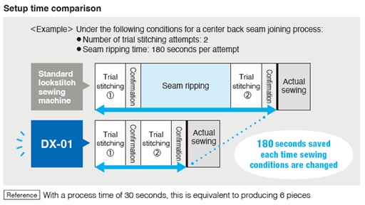 Smooth feed adjustment and trial stitching with no unraveling. Significantly reduced setup times.