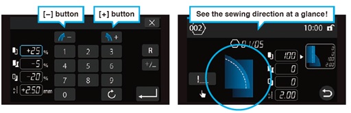 Configure the optimal feed amount simply and automatically by entering the differential value between the upper/lower and left/right belts as a ratio (%) relative to the set stitch length. Fine-tuning the feed with the [–] and [+] buttons is as easy and intuitive as using a dial. The on-screen illustration changes in real time according to the input values.