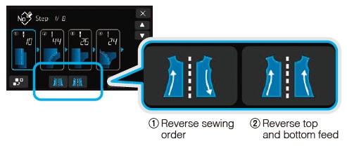 There’s no need for pattern re-entry when sewing the left side based on the right-side pattern: use function ①“Reverse sewing order” if the material position remains unchanged, or function ②“Reverse top and bottom feed” if the material is flipped upside down. (The differential amount must be readjusted.)