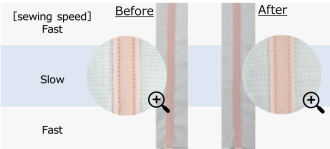By measuring the fabric thickness of flat and multilayered areas, sewing data (pitch, presser, sewing speed, thread tension, and number of stitches) can be set for each area.