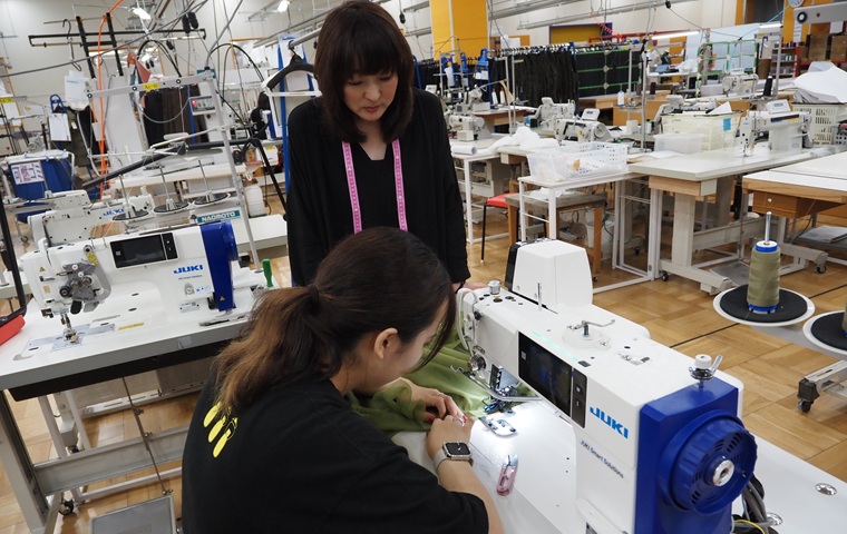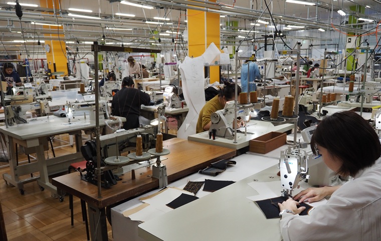 多くのスタッフが丸縫い出来る背景には、裁断から縫製、仕上げ、検品、物流までの一気通貫の体制と「流し縫い」と呼ばれる一着毎にアイテムを仕上げていくシステムが挙げられる。加えて技術の幅を広げているのは瀧定名古屋からの協力。現在、瀧定名古屋からメンズのスーツの技術者とレディスのドレスをメインにした重衣料系の技術者の二人が入っている。メンズのスーツを作るというよりは、メンズのスーティングのノウハウとレディスのカジュアルのノウハウをドッキングした物や、デニムのワークウエアのノウハウとドレスとをドッキングして作るなどいろいろなニーズがある。「それには技術の元としてメンズのテーラリングを持っていないといけない」(堀口社長)というわけだ。