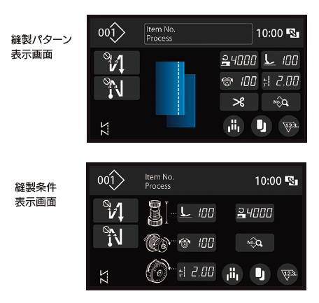 今縫っている縫製状況や調整頻度の高い「押え圧」「上糸調子」「縫い目長さ」を一目で確認できます。好みに応じて2種類の画面から選択できます。