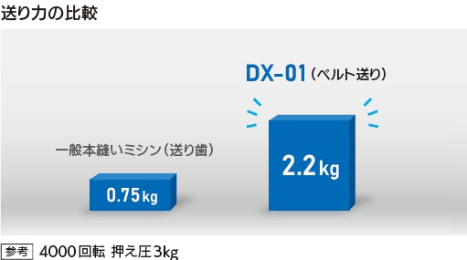 上下ベルト式は送り歯式と異なり上下動がなく、常に生地が押えと接触するため、高速回転時も高い送り力を維持。ベルトでしっかり生地を挟むことで、ジャンピングも防ぎます。
