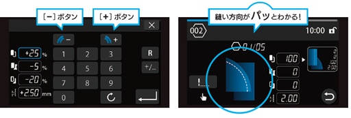設定した縫い目長さに対し、上下/左右ベルトの差動量を比率(%)で入力するだけで、最適な送り量が自動で設定されます。[+] [-] ボタン操作により、ダイヤル式の様に、送り加減を感覚的に調整することも可能。入力値によって、縫製パターンを表すイラストに切り替わります。