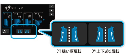 右側パターンを基に左側を縫製する際、生地を上下入れ替えない場合は「① 縫い順反転」、入れ替える場合は「②上下送り反転」で、簡単にパターンを反転することで、パターン入力の手間いらず。(差動量の再調整が必要)