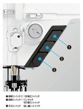 | 手元スイッチ | 3 連ボタン標準装備(出荷時:返し縫い、ワンタッチ切り替え、1 針補正) | |||||||||||||||||||||||||||||||
