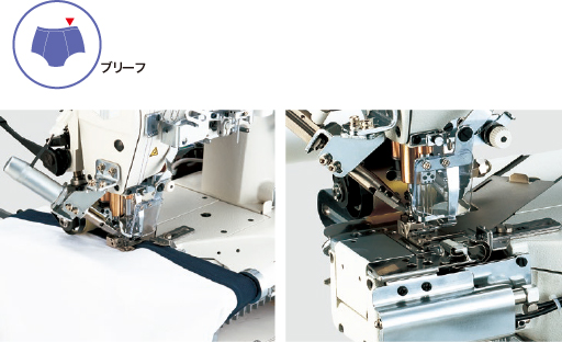 E23丸物スパンゴム付け仕様(エアーバインダー・テンションローラー付き)ブリーフのゴム入れ工程に最適な機種です。バインダーは、E 2 2は膝レバーで、E 2 3は膝スイッチで開閉します。テンションローラーが標準装備されていますので、大きさの違う身頃とゴムもスムースに縫い付けられます。縫い目の柔らかさから、伸びに対しても柔軟に対応できます。