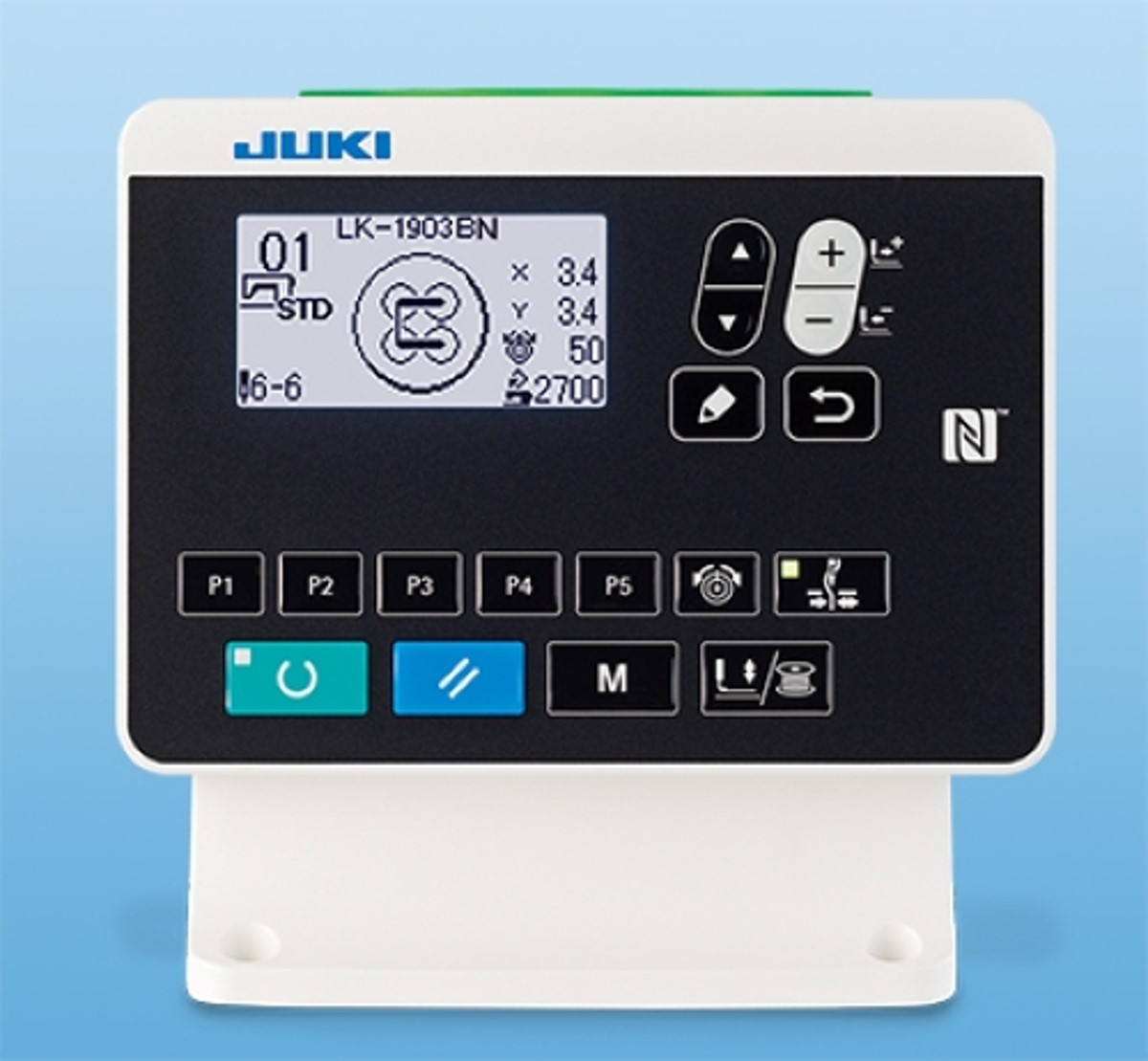 NFC搭載の液晶パネルにより、タブレットなどの通信端末を使用して縫製パターンおよび縫い調整値を簡単に他ミシンへ水平展開することが可能です。