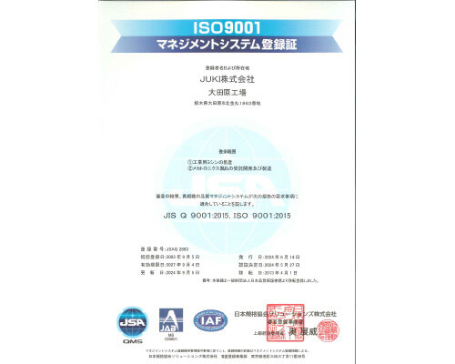 JUKIでは、各生産拠点においてISO9001を取得し、品質マネジメントシステムの維持向上を推進しています。マザー工場である大田原工場では品質活動について年間で計画を策定し、ISO審査やQC活動などに対応しています。